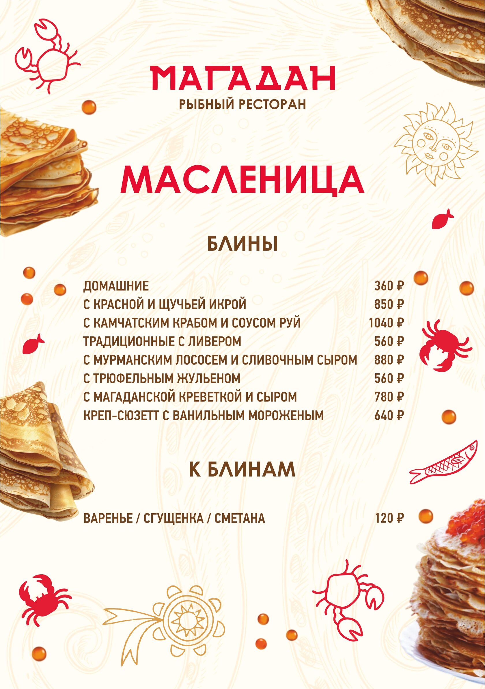 К масленичной неделе подготовили особенное блинное меню, где традиции сочетаются с фирменной подачей и свежайшими морепродуктами.